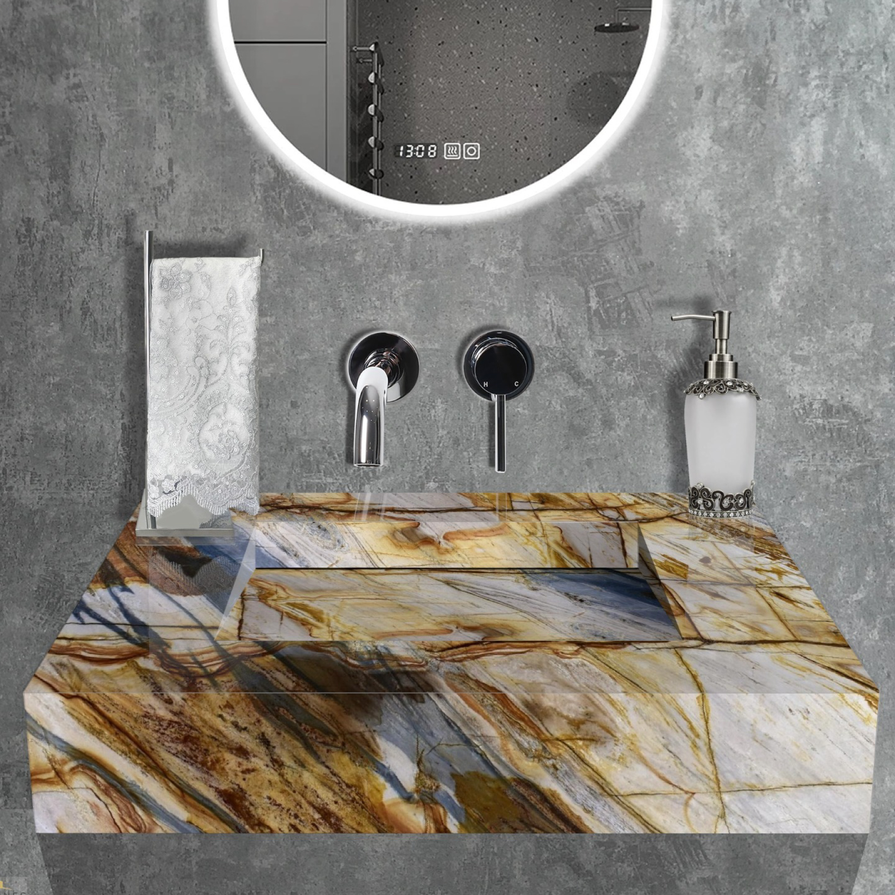 La Quartzite Colibrí Blue, importada de Brasil, es una piedra natural de alto impacto visual, reconocida por su mezcla vibrante de tonos azules, dorados, blancos y vetas profundas que crean un movimiento artístico único. Su apariencia expresiva y sofisticada aporta dinamismo, exclusividad y un carácter distintivo a los espacios.