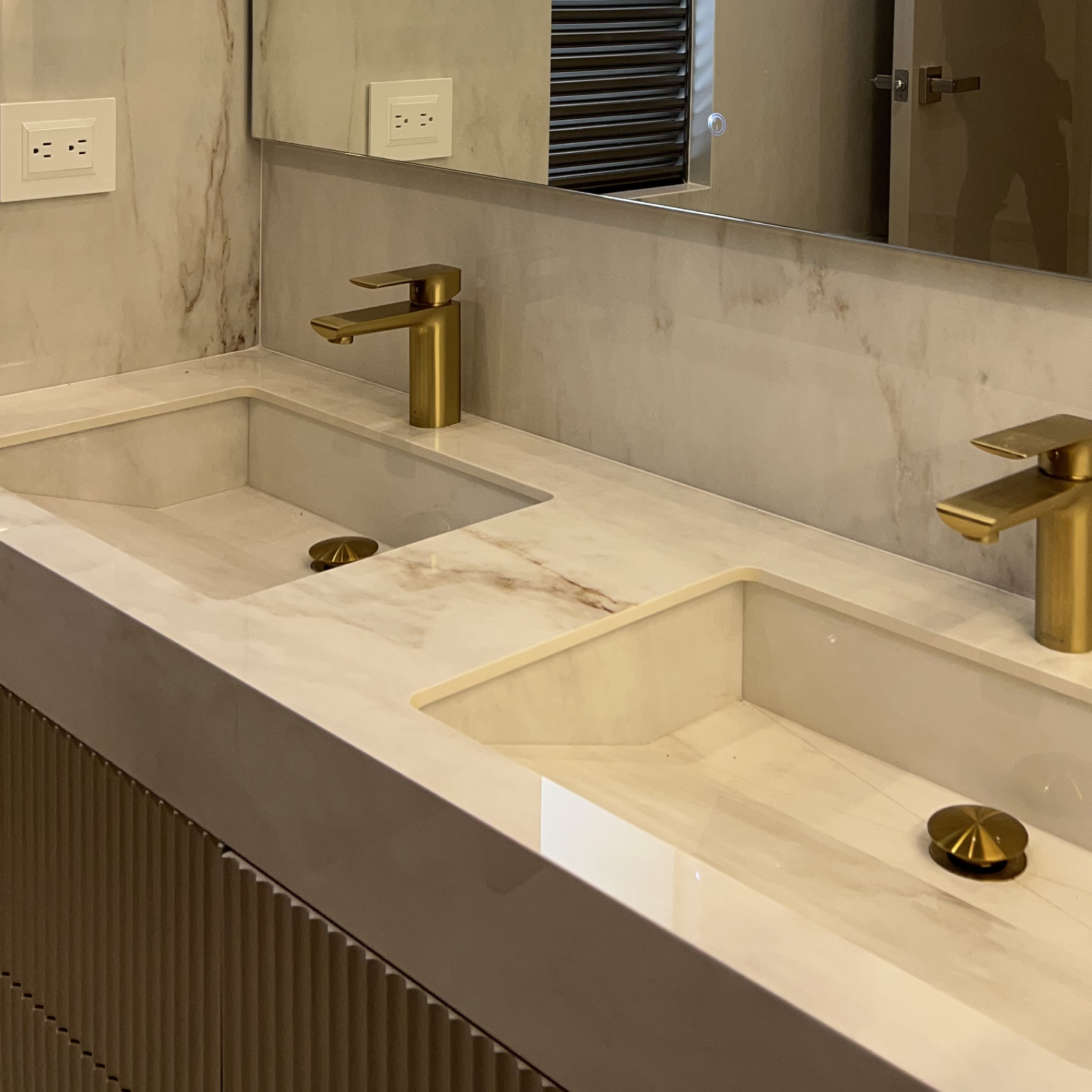 La piedra sinterizada Calacutta Bianco Oro, importada de India con tecnología italiana, combina un fondo blanco luminoso con delicadas vetas doradas que evocan elegancia, sofisticación y calidez. Su diseño refinado aporta profundidad visual y un brillo sutil que realza los espacios, convirtiéndolos en ambientes serenos, acogedores y llenos de carácter.