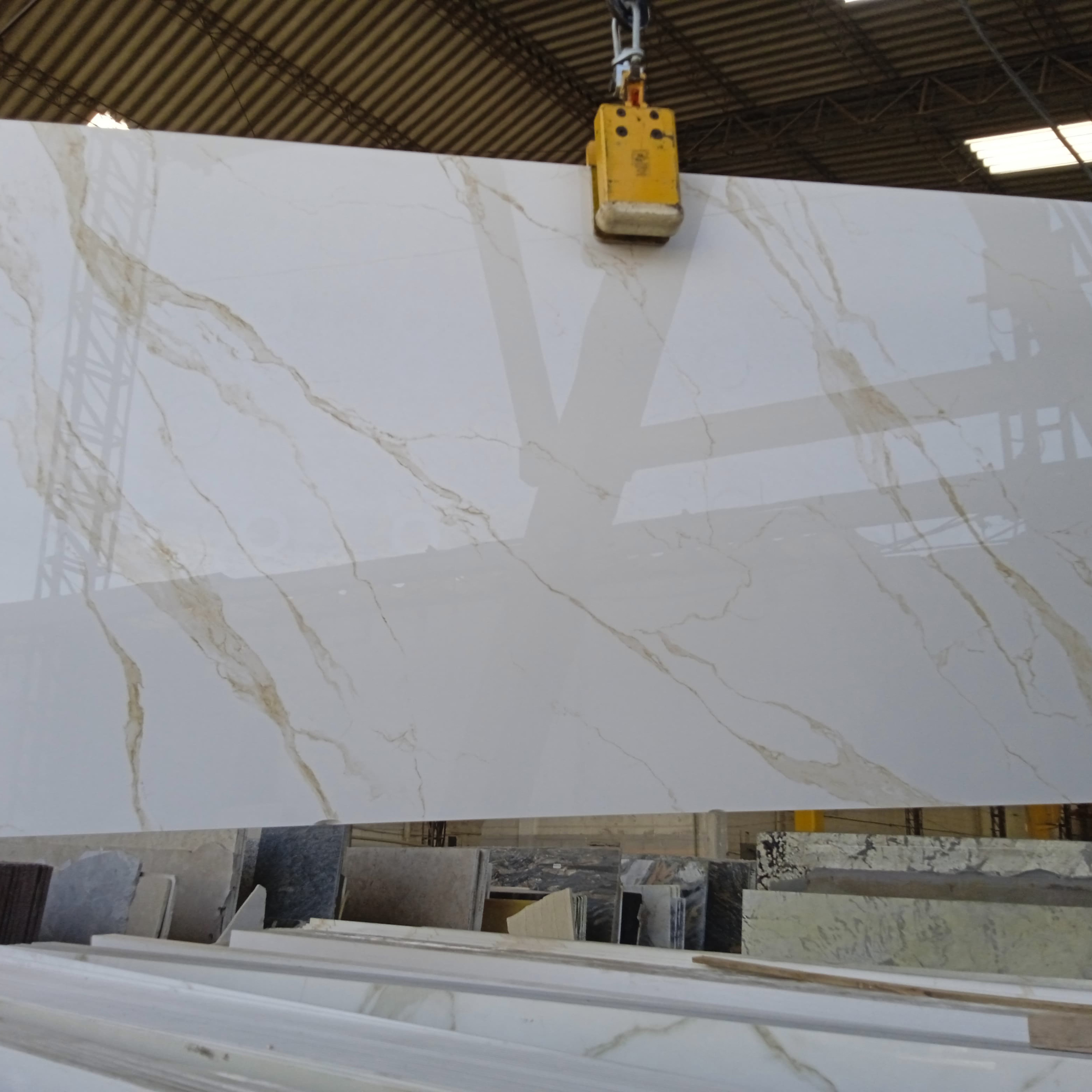 La piedra sinterizada Calacata Oro, importada de China, evoca la elegancia del mármol clásico con un toque moderno que transmite luminosidad y armonía en cada espacio. Sus delicadas vetas doradas sobre fondo blanco generan una sensación de confort, calidez y sofisticación, ideal para crear ambientes acogedores y llenos de estilo.