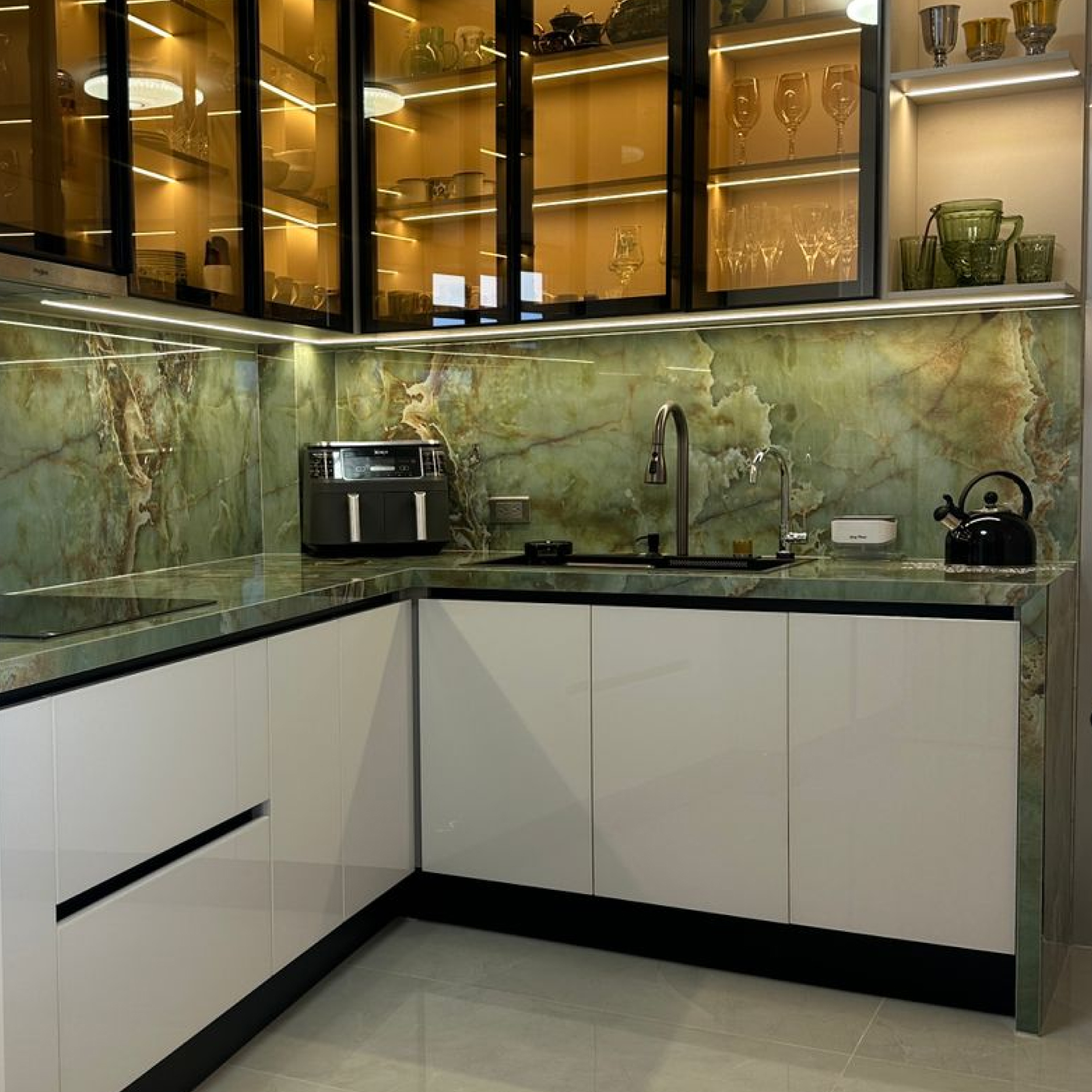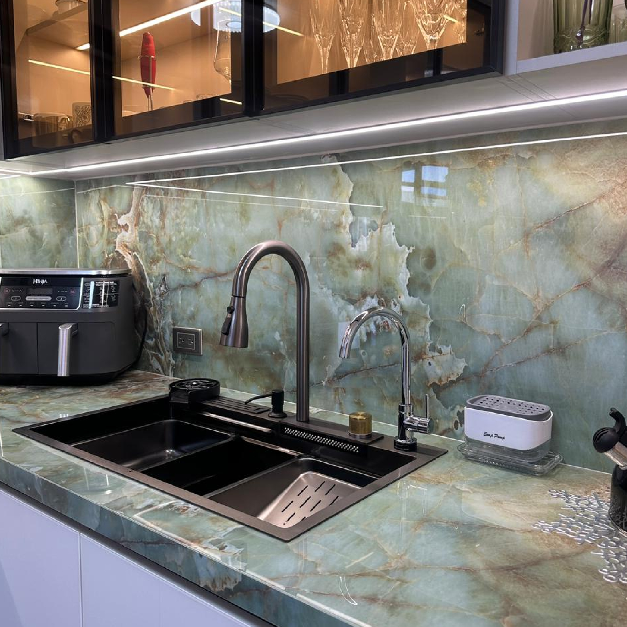 La piedra sinterizada Ónice Persa, importada de India con tecnología italiana, sorprende con sus tonos verdes y matices cobrizos que evocan la fuerza de la naturaleza y la riqueza de lo exótico. Su diseño singular transmite calidez, carácter y sofisticación, convirtiendo cada espacio en un ambiente único y lleno de personalidad. Perfecta para quienes buscan un material que combine impacto visual y elegancia atemporal, se adapta tanto a estilos clásicos como contemporáneos, aportando un toque distintivo en encimeras, baños, pisos, muros y revestimientos.